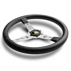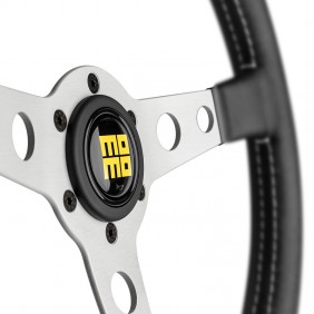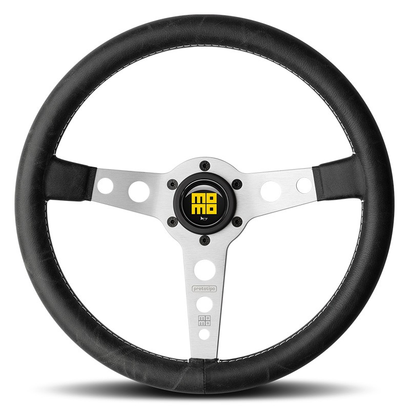 Prototipo ist und bleibt ein Symbol für die Geschichte von MOMO: in dieser Version noch edler durch das samtweiche schwarze Vintage-Leder und die sich farblich absetzende weiße Naht mit parallelen Stichen. Die gelochten Speichen und der Knopf mit dem MOMO-Logo Heritage ergänzen den Old-fashioned-Look. Durchmesser, Griff und Schüsselung sind im Vergleich zur klassischen Version unverändert.
