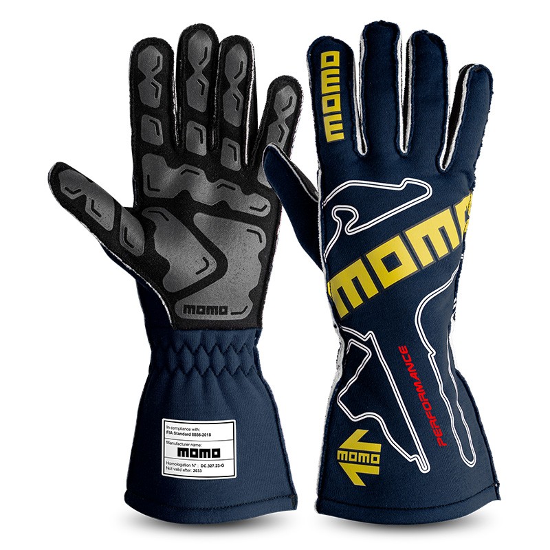 Gants de compétition homologués FIA 8856-2018. Les gants Momo Performance présentent un design dynamique qui reprend les silhouettes des circuits de sport automobile les plus célèbres.