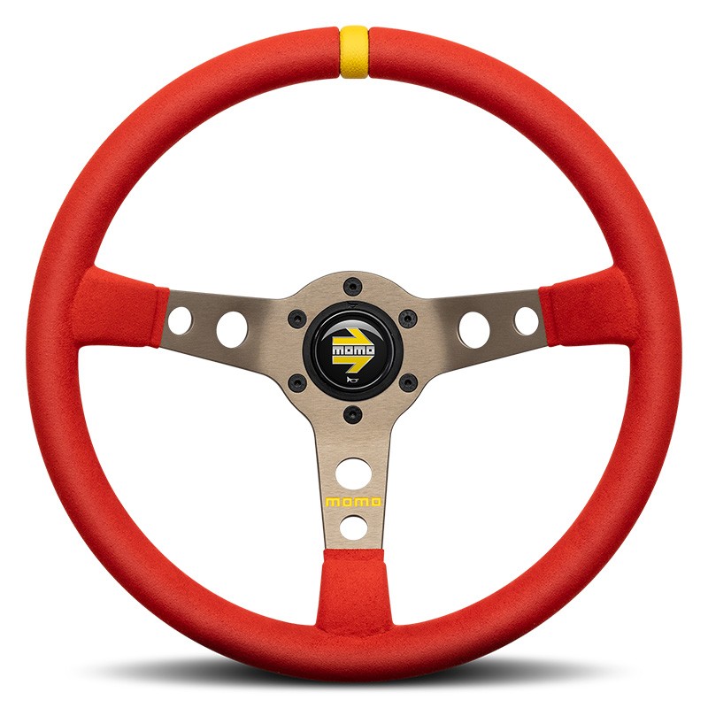 L’un de nos volants de course les plus emblématiques, le MOD. 07, est désormais disponible dans une nouvelle version routière en microfibre rouge ou bleue ! Ses caractéristiques distinctives sont : une profondeur de calage de 72 mm, une branche anodisée anthracite avec logo MOMO émaillé jaune, un insert en cuir jaune sur la partie supérieure permettant d’indiquer d’un simple coup d’œil l’angle de braquage, ainsi qu’un bouton central noir brillant avec logo MOMO chromé et flèches jaunes.
